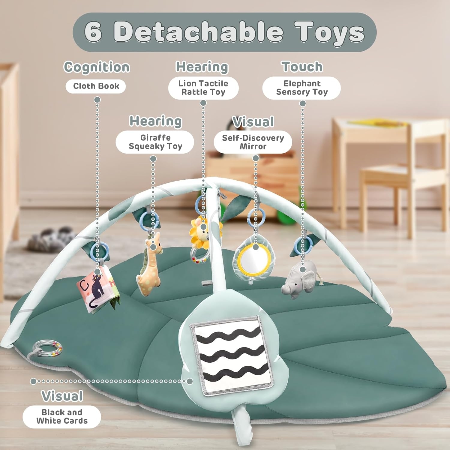 | Antal leksaker | 6 sensoriska hängleksaker |