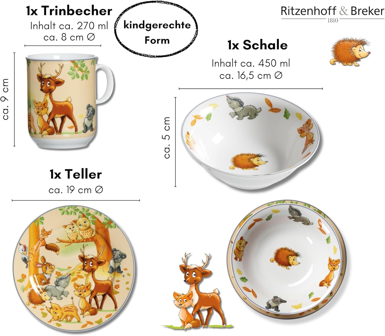 Gör måltiderna roligare med detta 3-delars barnservisset i porslin med charmiga skogsdjur. Setet innehåller en drickmugg med handtag, skål och tallrik – allt i rund, barnvänlig design. Tillverkat av högkvalitativt porslin som tål både diskmaskin och mikrovågsugn. Levereras i en fin presentförpackning, perfekt till dop, födelsedag eller jul!