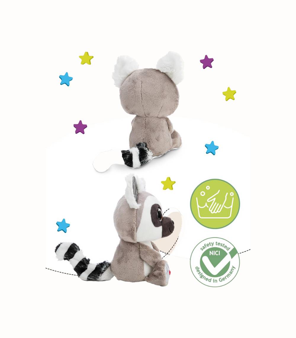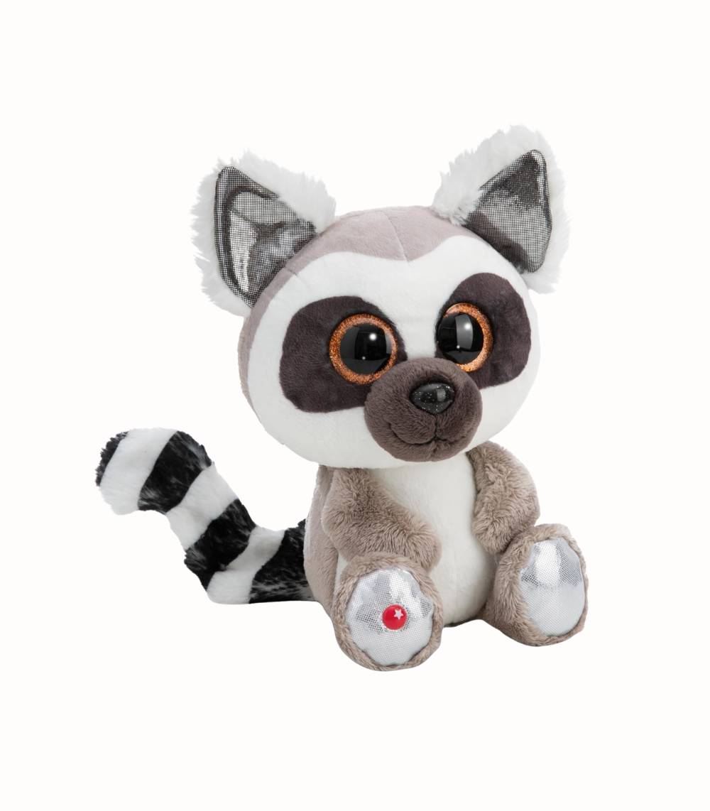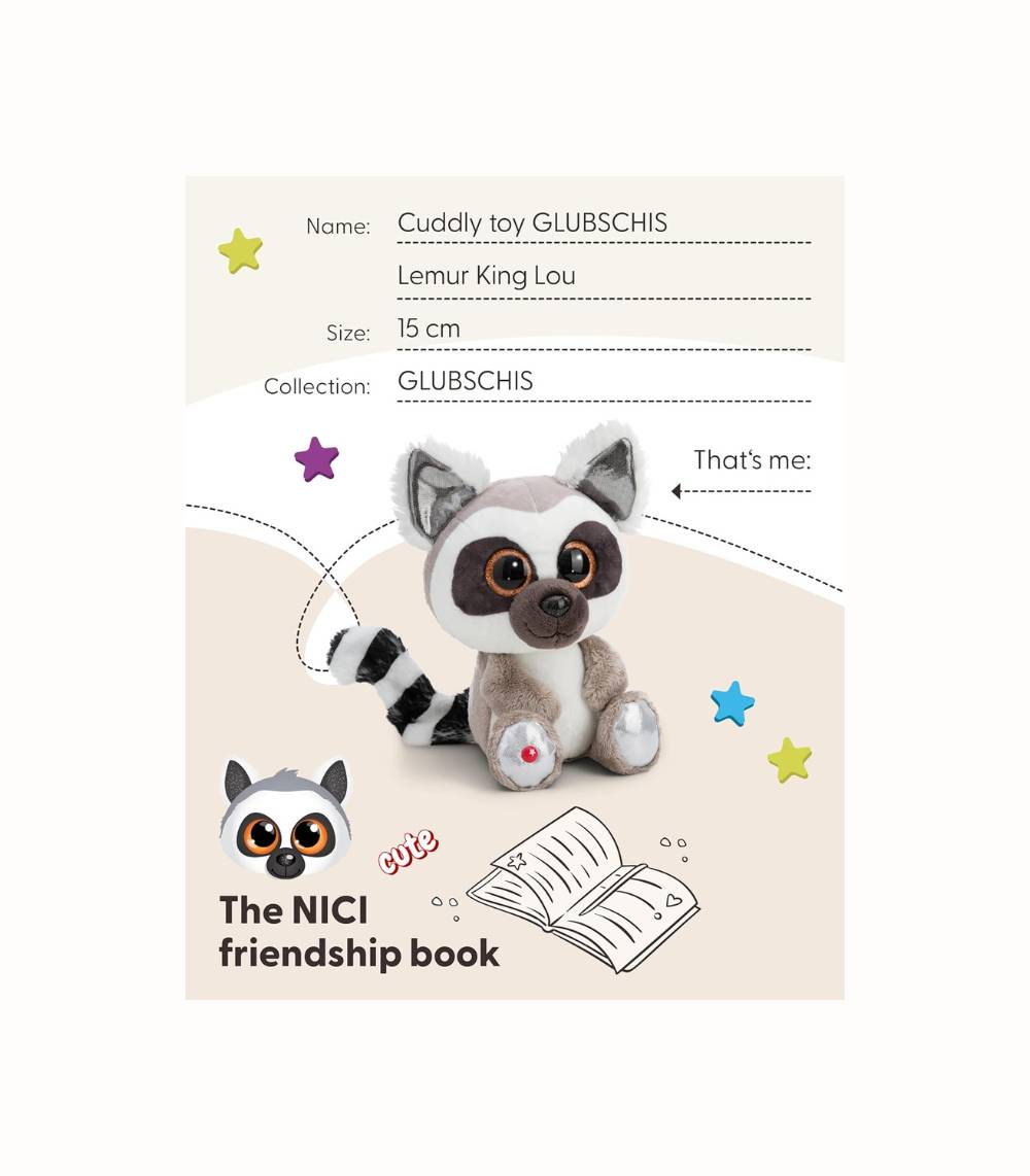GLUBSCHIS lemur King Lou från NICI – en mjuk och fluffig plyschvän med glänsande silvriga öron och stora bruna glitterögon. Den långa, ringlade svansen gör den till en unik och gosig samlarleksak. Perfekt för både barn och vuxna som älskar kramvänliga gosedjur.
