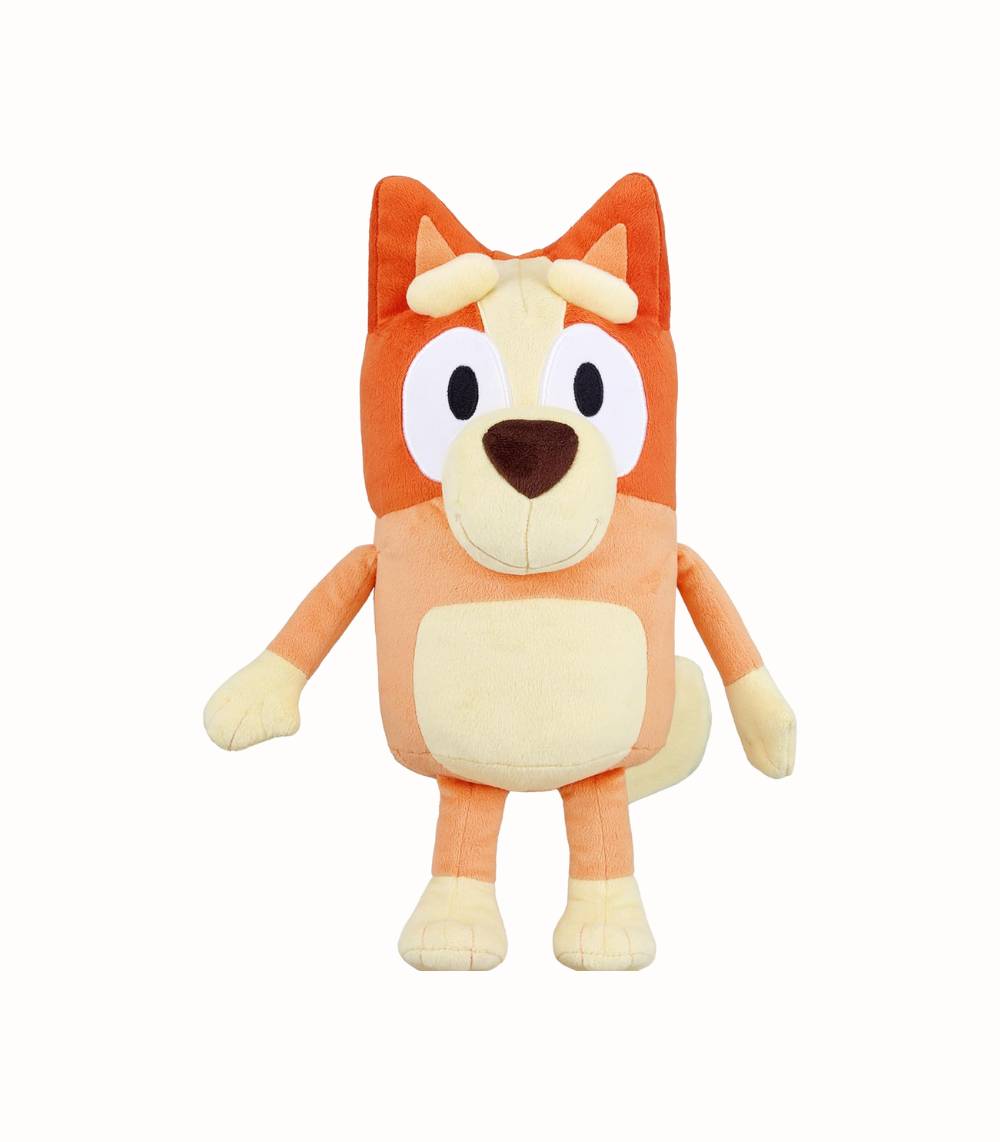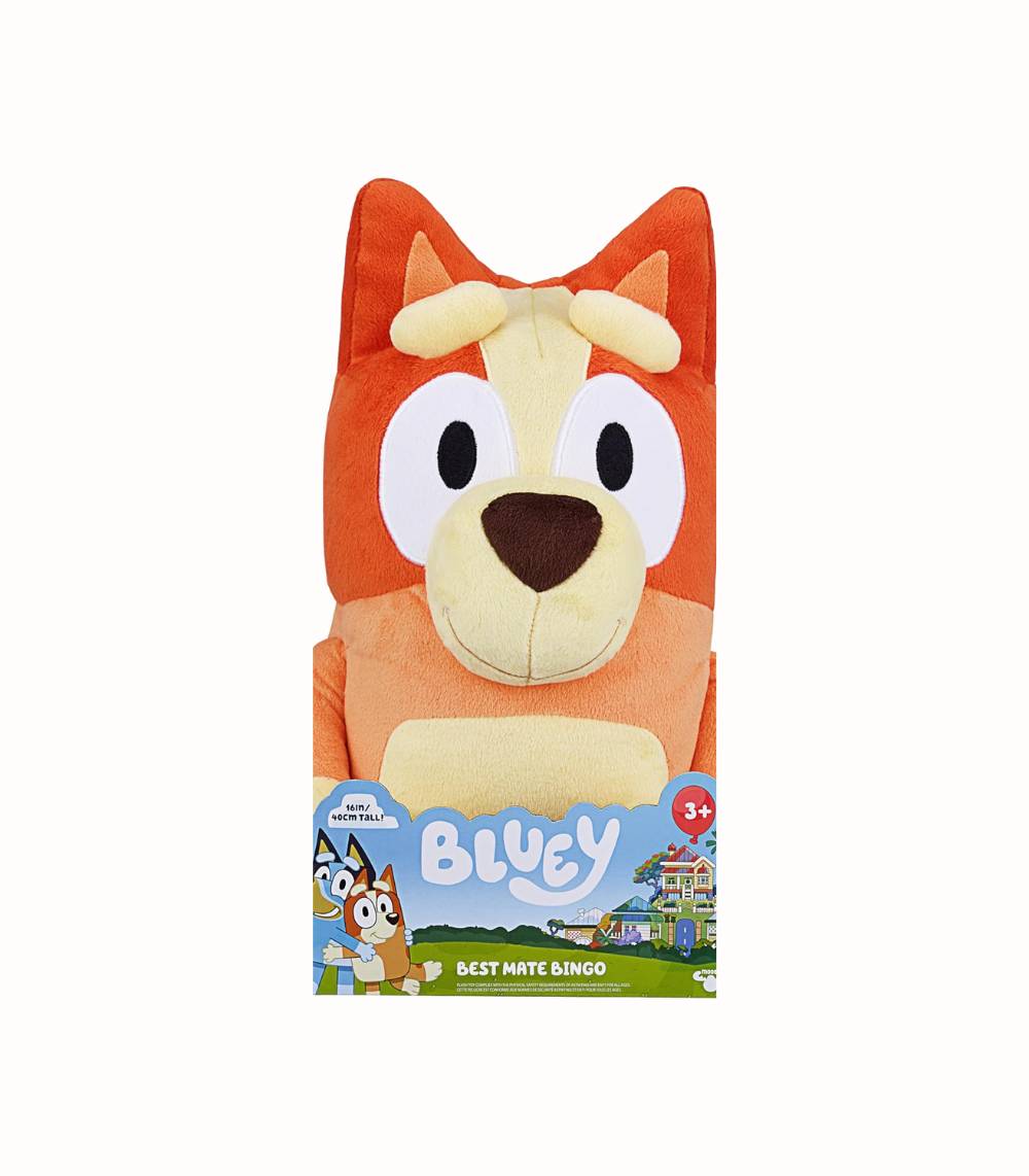 Mjuk och extra stor Bingo från den älskade serien Bluey! Detta gosedjur på 45 cm är perfekt för stora kramar, mysiga stunder och fantasifulla lekar. Tillverkad i plysch av hög kvalitet med fina broderade detaljer. Passar barn från 3 år och uppåt – en gosig vän som blir en favorit både till leken och vid läggdags.