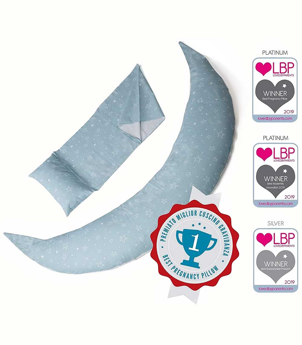 En flexibel kudde för gravid- och amningsstöd med justerbar rygg- och magstöd som håller dig på vänster sida hela natten. En trygg följeslagare genom hela graviditeten – från vila till närhet.