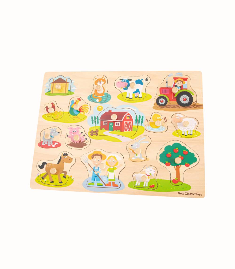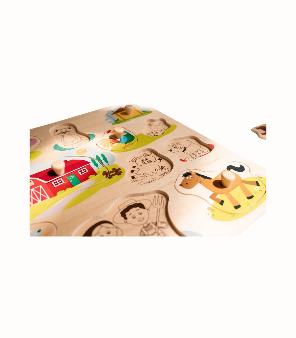 Ett färgstarkt träpussel med 16 bitar som visar olika motiv från en gård. Pusslet passar barn från 2 år och hjälper till att utveckla matchningsförmåga samt finmotorik. Tillverkat av miljövänligt FSC-certifierat trä och följer höga säkerhetskrav enligt EN-71.