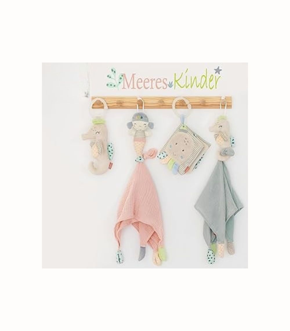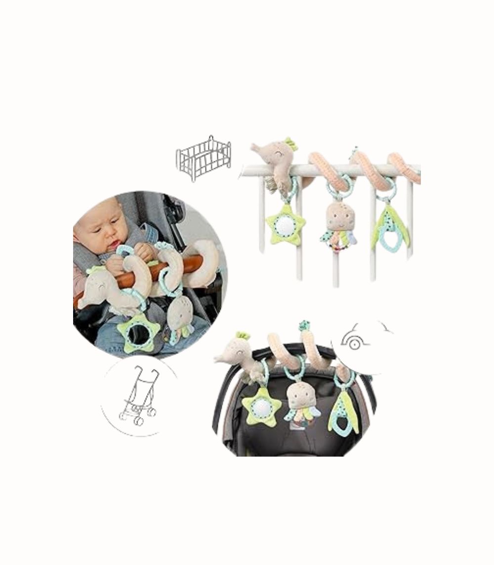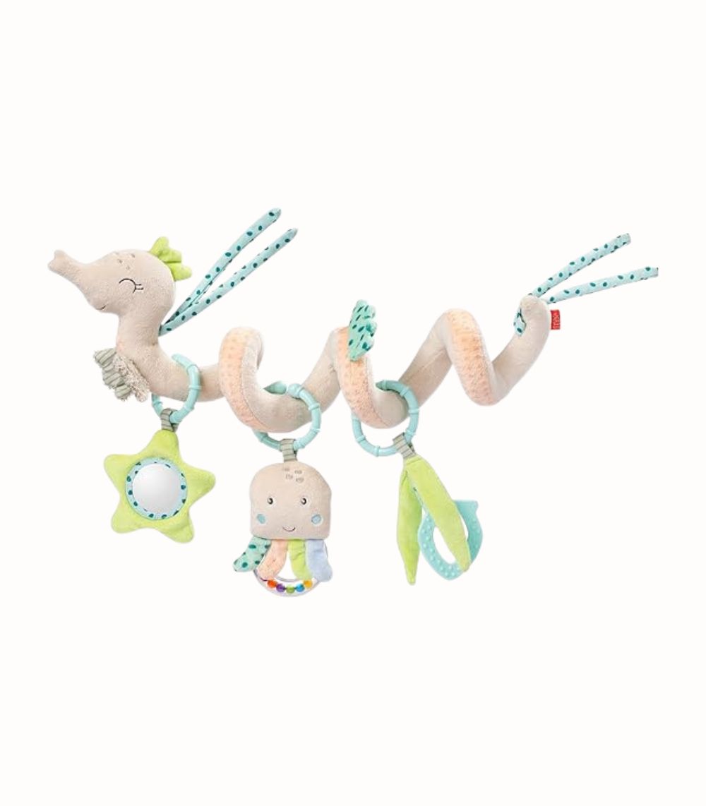 En pedagogisk och färgglad spiral i form av en sjöhäst som fästs runt barnvagn, babyskydd, säng eller lekhage. Den har flera hängande delar: skallra, pip, prasselpapper, spegel och bitring — perfekt för att stimulera syn, hörsel, känsel och motorik hos bebisar från 0 månader. Tillverkad i velour och mjukt tyg, fylld med 100 % polyester, och tvättbar i 30 °C