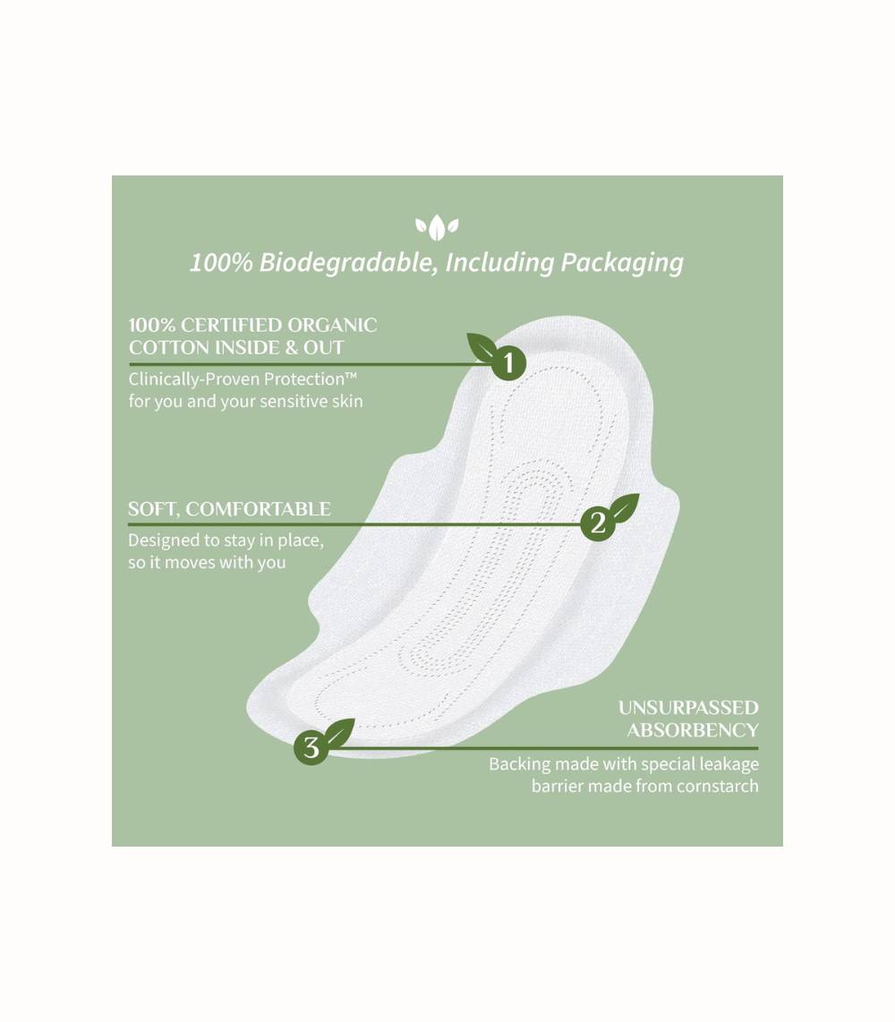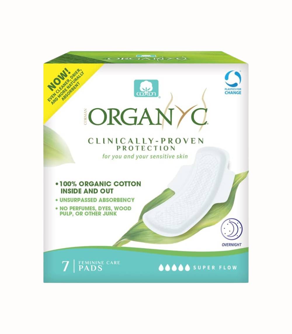 Organyc Övernattningsskydd 2.0 ger superabsorberande skydd för kraftig blödning under natten. Tillverkade av 100% ekologisk bomull utan kemikalier, parfym eller färgämnen, vilket gör dem extra skonsamma för känslig hud. Dessa skydd är pH-balanserade, hypoallergena och har vingar för säker passform. Kliniskt bevisade för att hålla dig torr och bekväm med ett miljövänligt, nedbrytbart material.