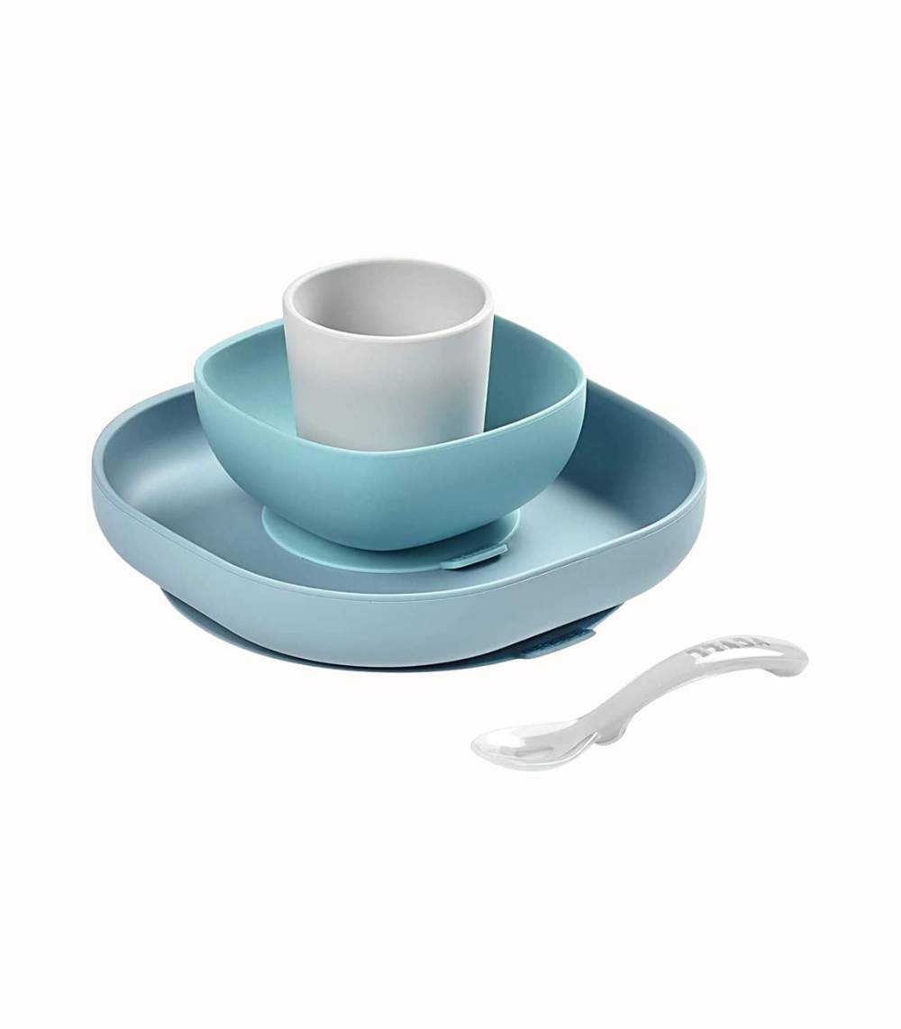 Praktiskt och hållbart matset i silikon med sugkopp för säkra måltider. Setet innehåller tallrik, skål, glas och sked – allt du behöver för barnets första matstunder. Tål diskmaskin och mikrovågsugn och har halkfri botten för extra trygghet. Perfekt för små barn och föräldrar som vill göra måltider både enkla och roliga!