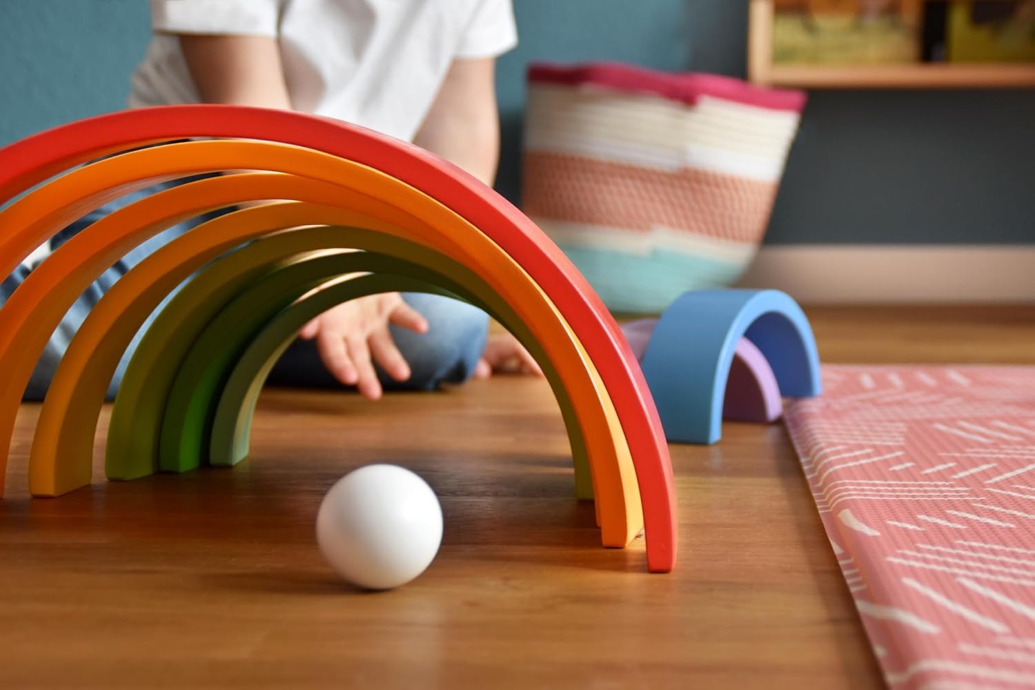Upptäck färgglada regnbågsklossar i trä som bjuder in till kreativ lek, stapling och sortering! Setet innehåller 5 halvcirkelformade delar i klara, vattenbaserade och salivbeständiga färger. Perfekt för små händer och utformat för att främja motoriska färdigheter, hand-öga-koordination och kreativt tänkande från 12 månader och uppåt. Delarna kan användas för att bygga broar, tunnlar och fantasifulla konstruktioner, vilket stimulerar den rumsliga perceptionen och kreativiteten.