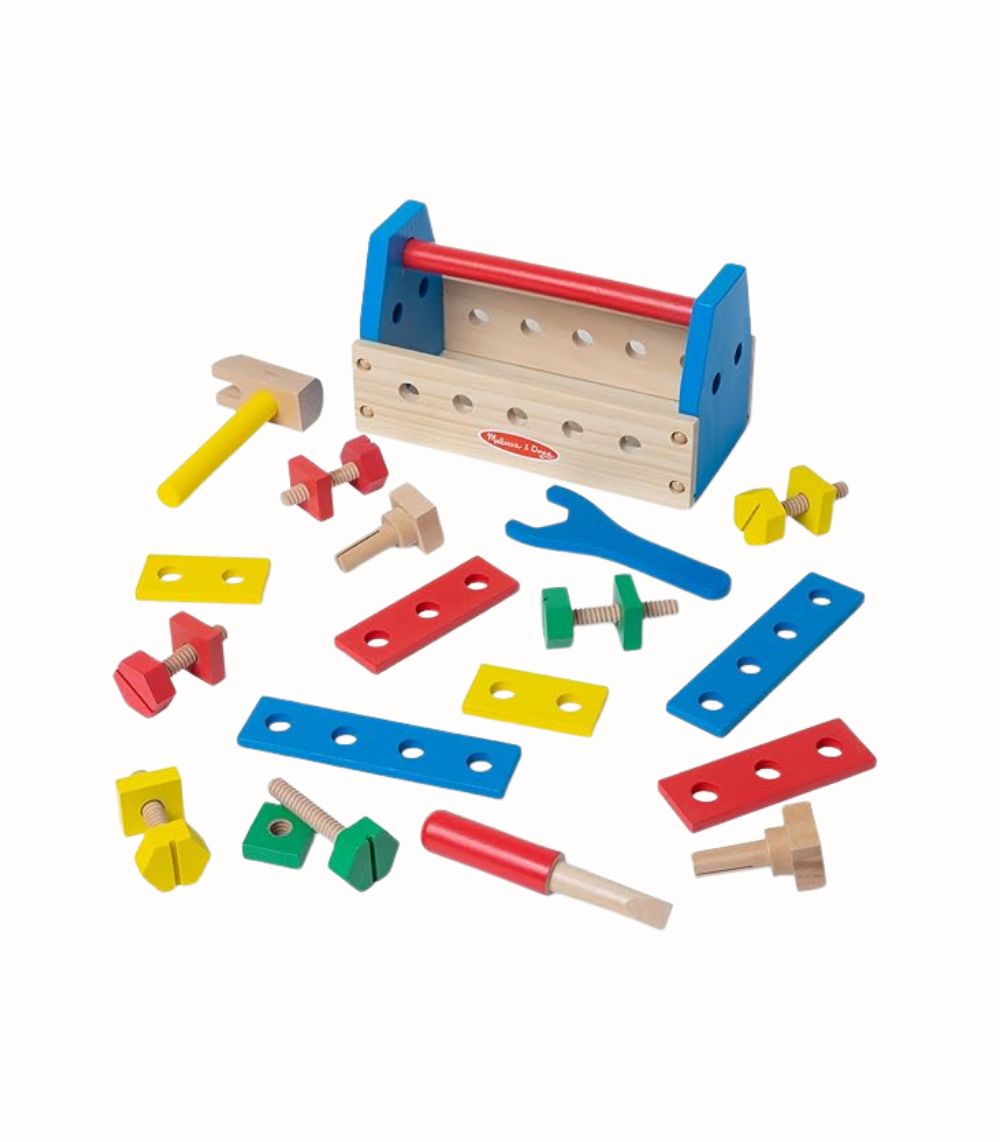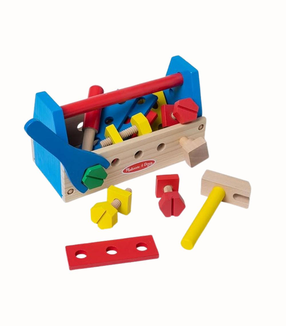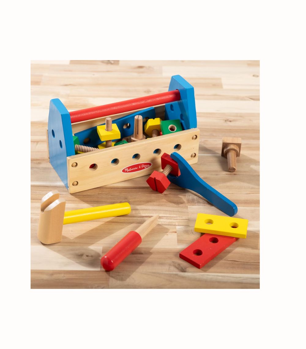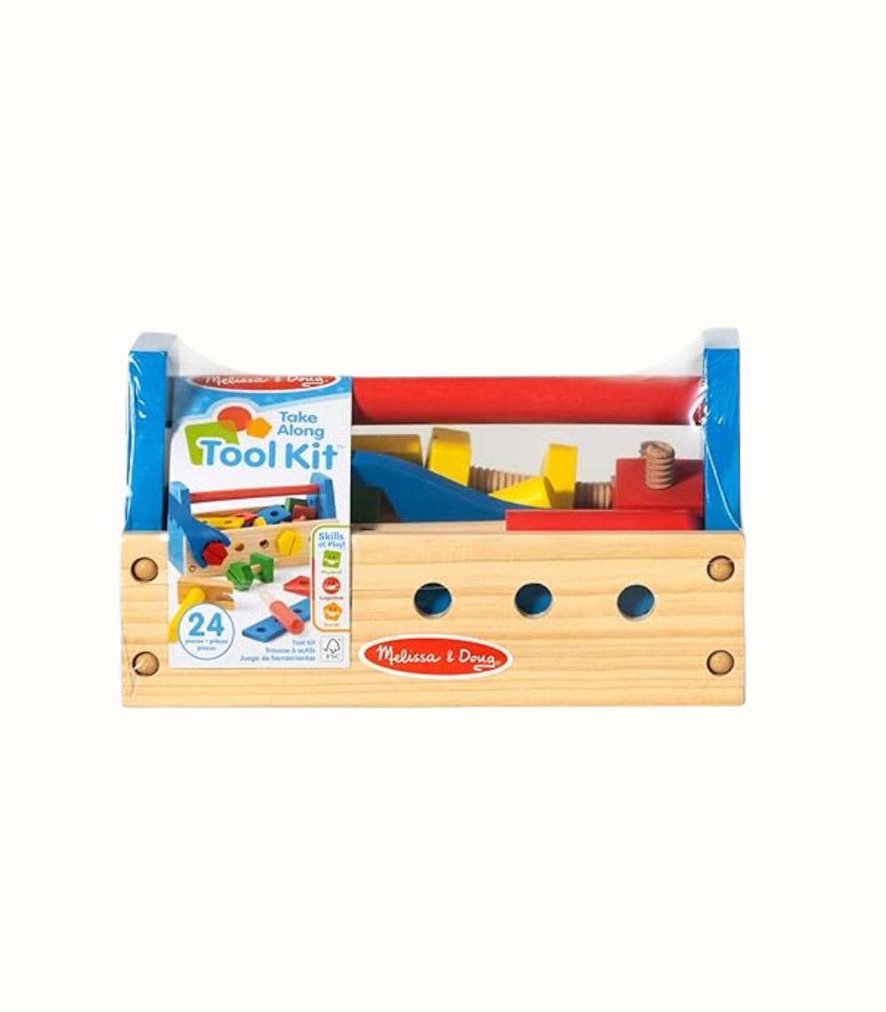Trä Verktygslåda Take-Along inspirerar unga byggare med 24 robusta trädelar för kreativa projekt – perfekt för rollspel och motorikträning. Inkluderar barnstorlek hammare, skruvmejsel, skiftnyckel, spikar, skruvar och brädor med hål för montering. Lådan stänger säkert med handtag för enkel förvaring och transport. Ljusa färger och rundade kanter säkerställer trygg lek. Främjar hand-ögon-koordination, sortering, räkning och problemlösning – en tidlös favorit som väcker fantasi och självförtroende hos små snickare.